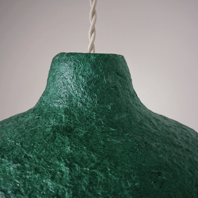 La suspension Paris est en papier-mâché teinté vert foncé.