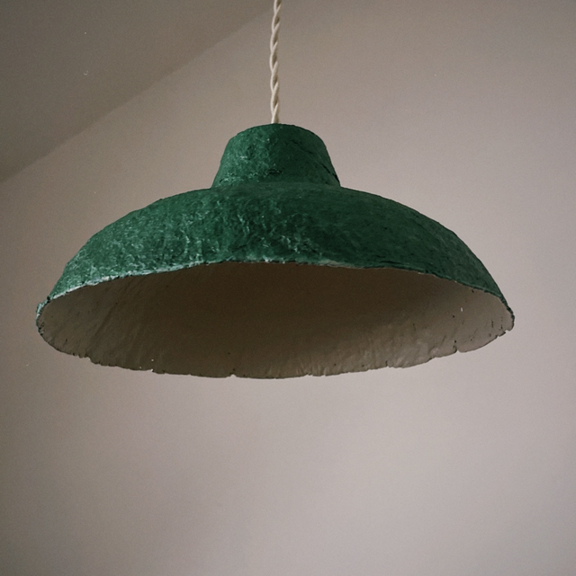 Le papier-mâché est obtenu en mélangeant de la pulpe de papier recyclé et de la colle vinylique. Les couleurs sont ensuite obtenues en ajoutant des pigments à la préparation. L'intérieur de l'abat-jour est enduit pour éviter une réflexion de lumière colorée.