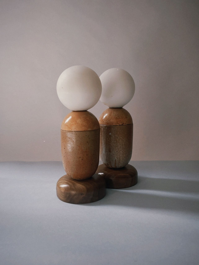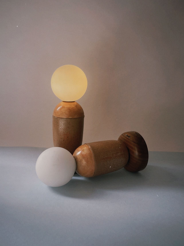 Elle est fabriquée en plâtre, noyer et céramique recyclée surmontée d'un globe en verre opalin.